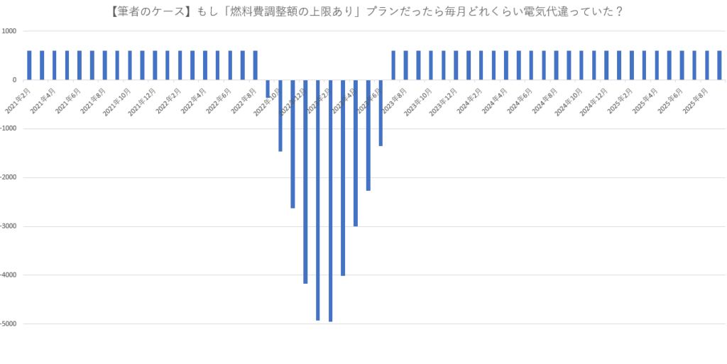 筆者の場合、現状は「燃料費調整額の上限なし」プランですが、もし「燃料費調整額の上限あり」プランにしていたらどれくらいの差があったかグラフにしてみました。