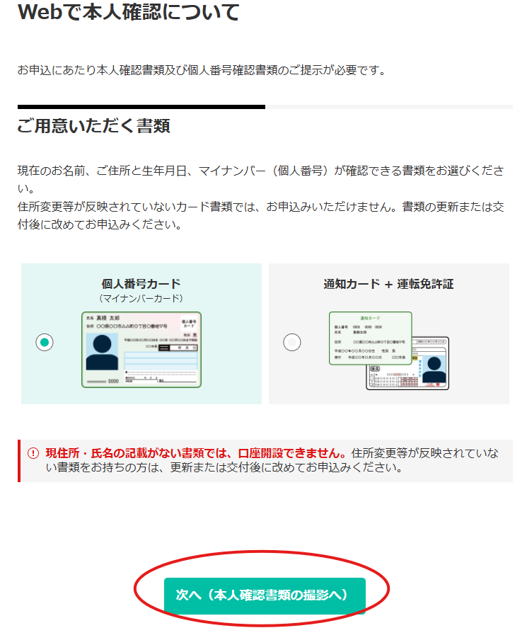 選択後、「次へ(本人確認書類の撮影へ)」をクリックします。