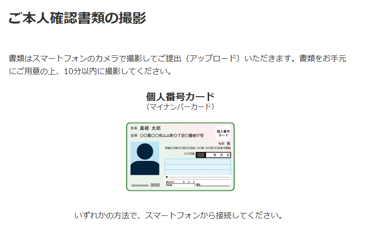 予めお手元にマイナンバーカードなどの本人確認書類をご用意いただくと、作業がスムーズに進むと思います。