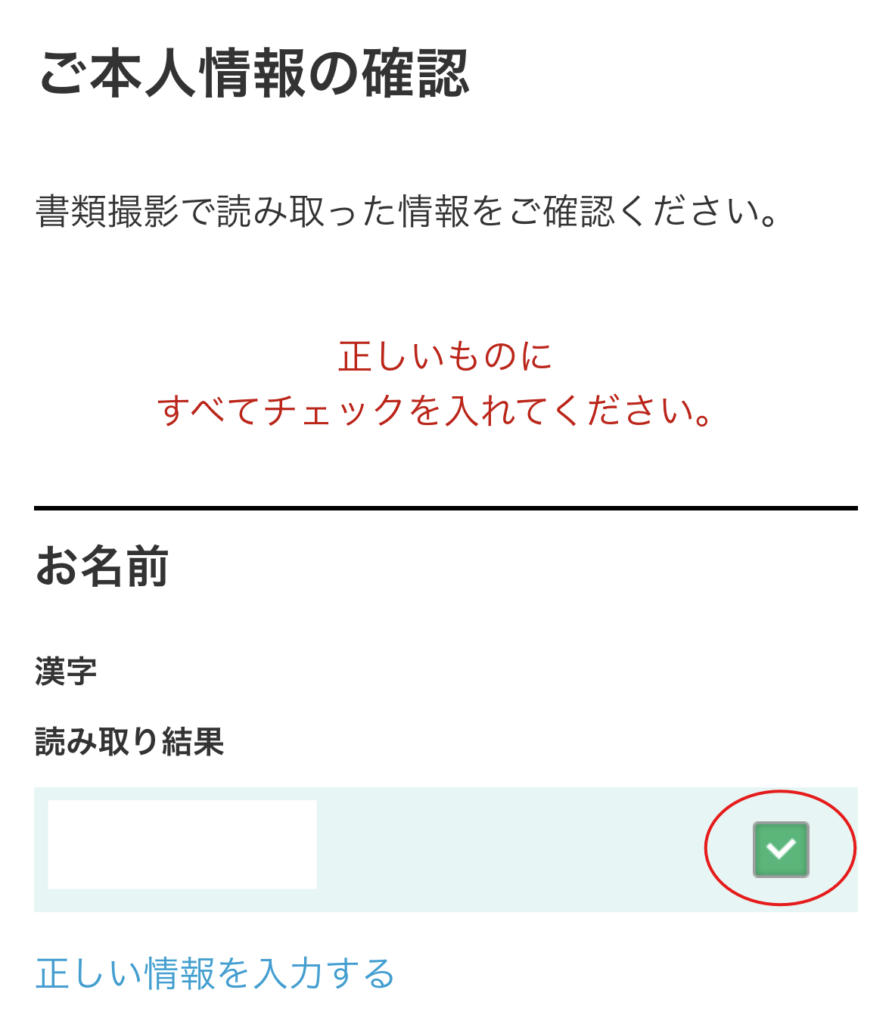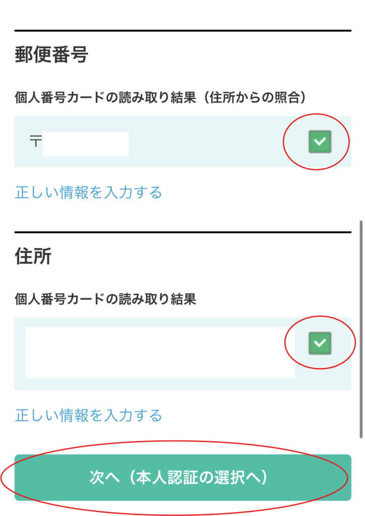 ご自身の情報が正しければ、チェックを入れていき、「次へ(本人認証の選択へ)」ボタンをクリックします。