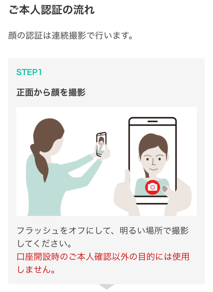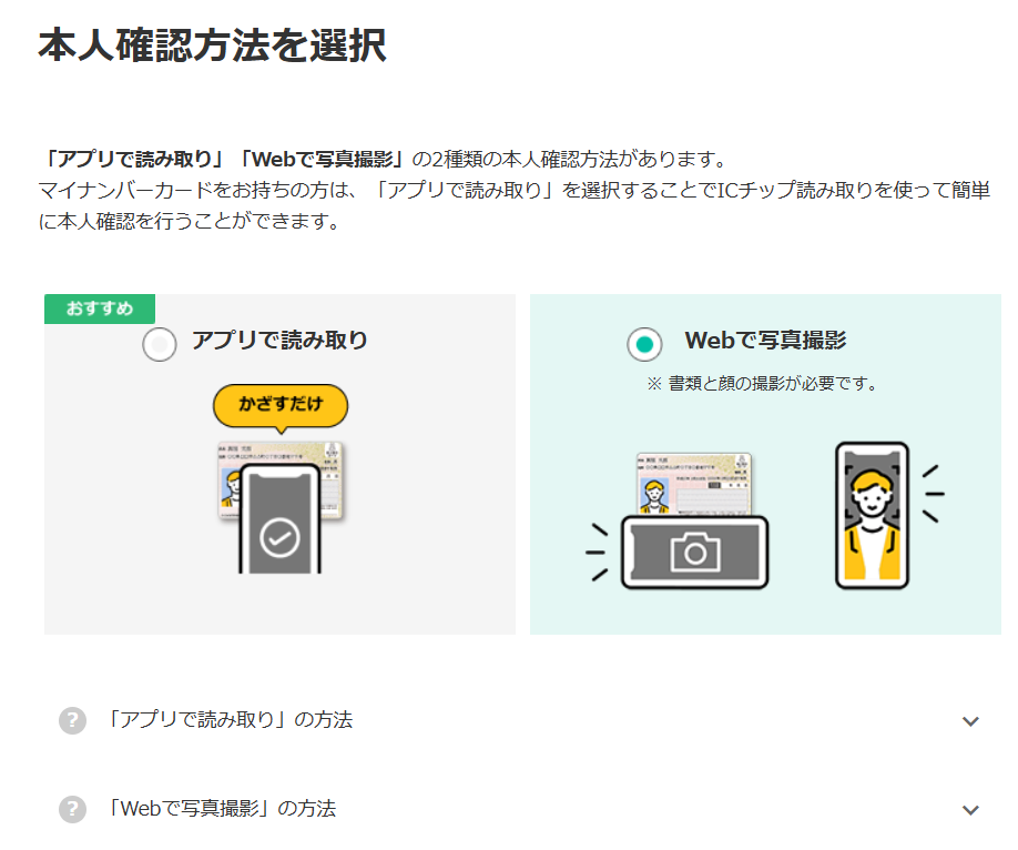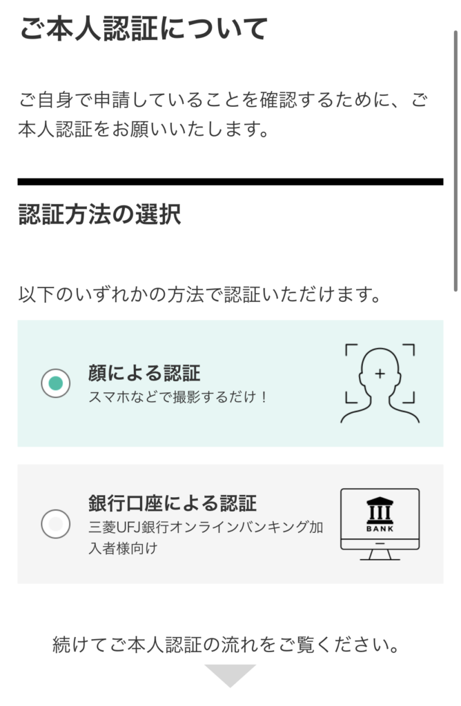 11.本人認証の方法を「顔による認証」か「銀行口座による認証」から選択します。