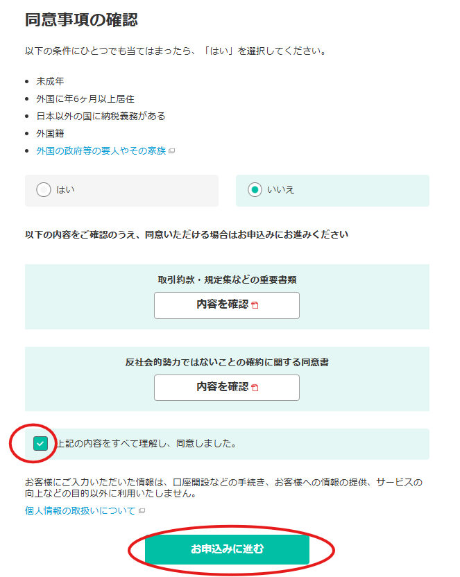 3.お申込み前の同意事項の確認をして、「上記の内容をすべて理解し、同意しました。」にチェックを入れ、「お申込みに進む」をクリックします。