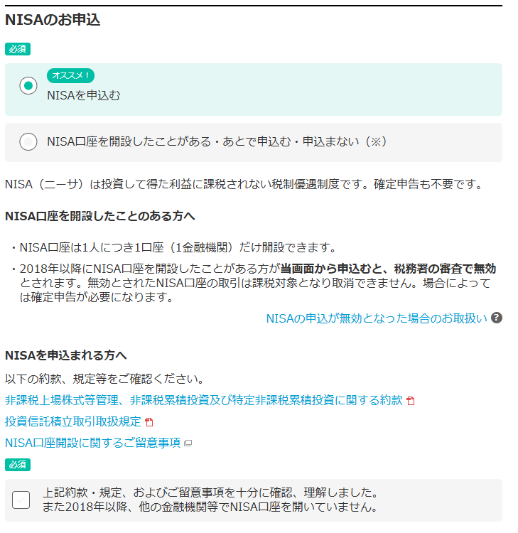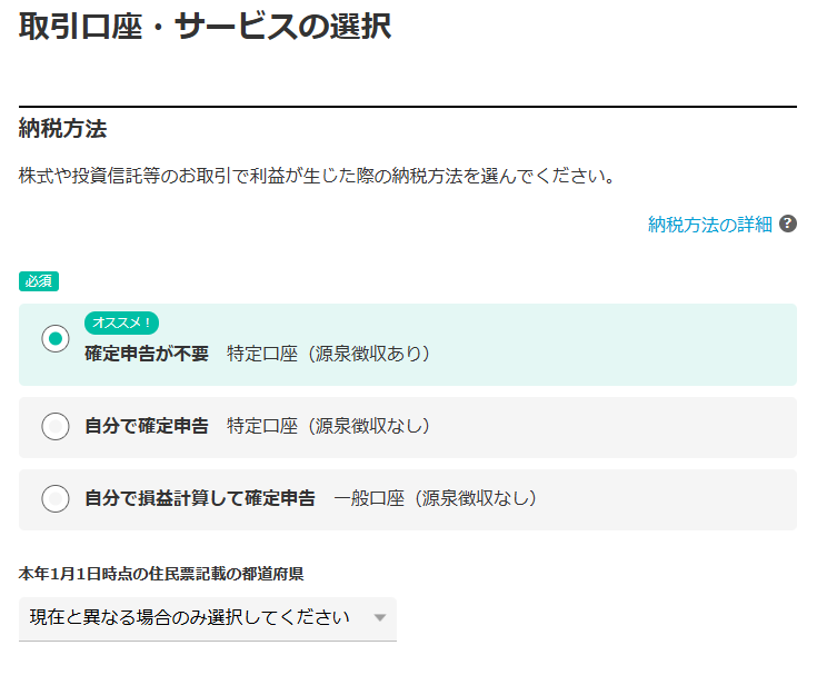 ここで「納税方法」を選びますが、「確定申告が不要 特定口座(源泉徴収あり)」がおすすめです。(初めて投資する人や忙しい人には「確定申告の手間がない」「税金計算のミスがない」という安心感があります)