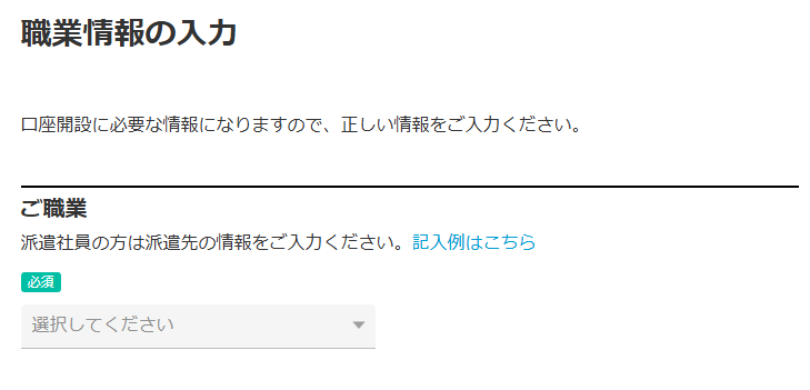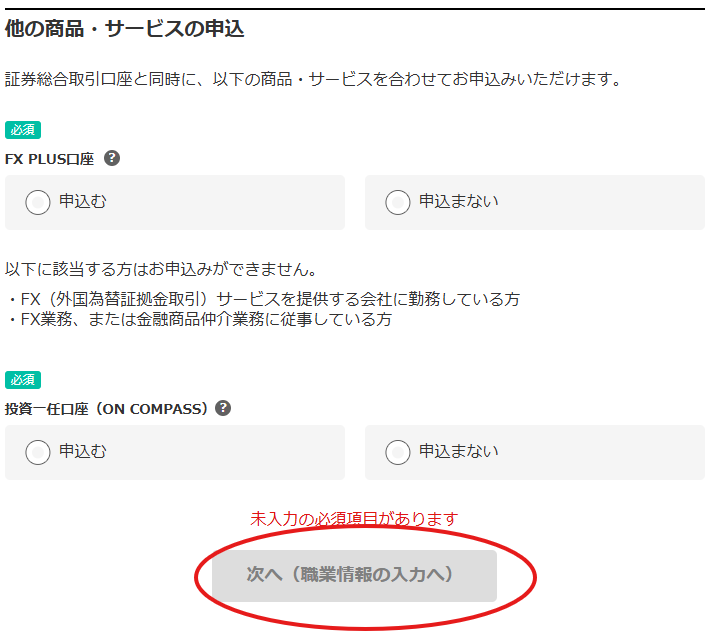 15.納税方法、NISA口座を開設するか、FX口座などを開設するかを入力し、「次へ(職業情報の入力へ)」をクリックします。