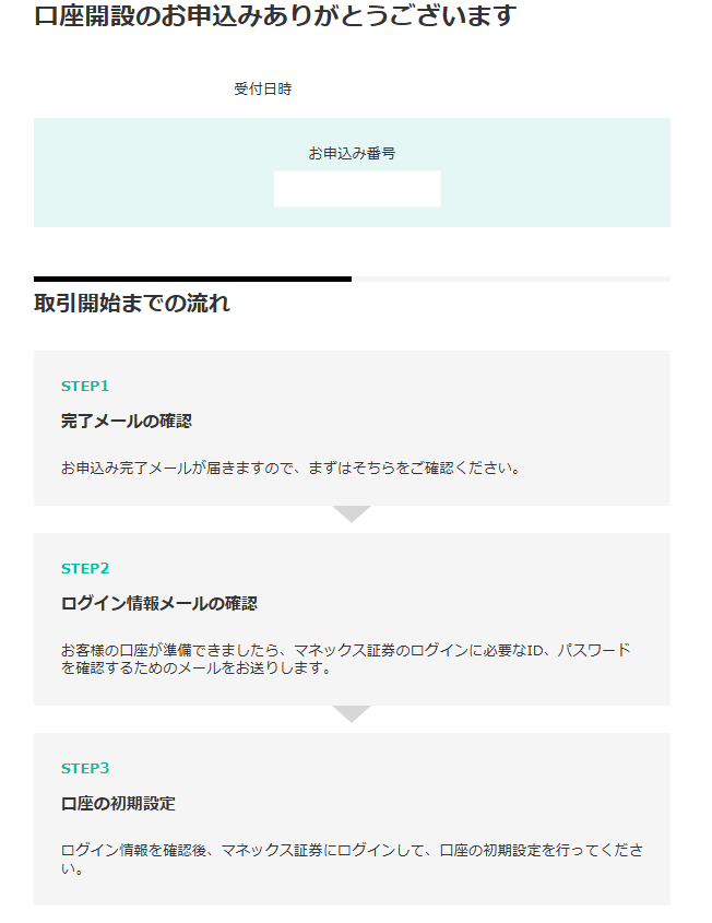 19.【この後の流れ】最短で申込日の翌営業日に「【マネックス証券】証券総合取引口座開設完了のお知らせ」というタイトルのメールが送られてきます。このメールが届いたら、ログインと初期設定を行い、入金すれば取引を開始することができます。