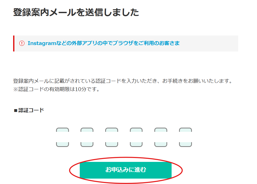 5.登録案内メールが届くので、記載されている認証コードを入力し、「お申込みに進む」をクリックします。