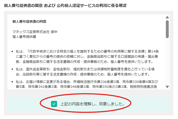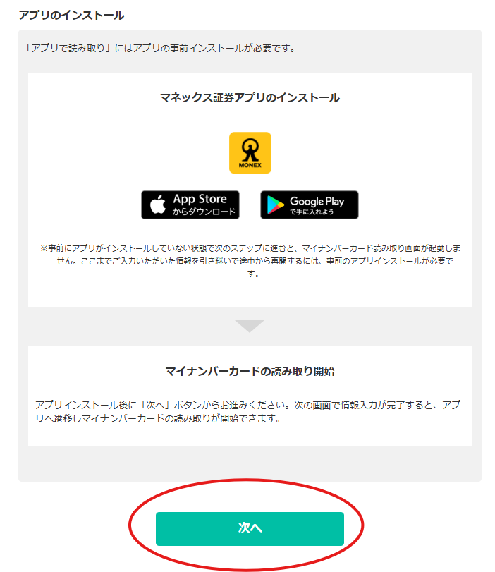 「アプリで読み取り」か、「Webで写真撮影」のいずれかを選択し、「個人番号提供書の同意 および 公的個人認証サービスの利用に係る確認」を確認の上「上記の内容を理解し、同意しました。」にチェックを入れ、「次へ」ボタンをクリックします。
