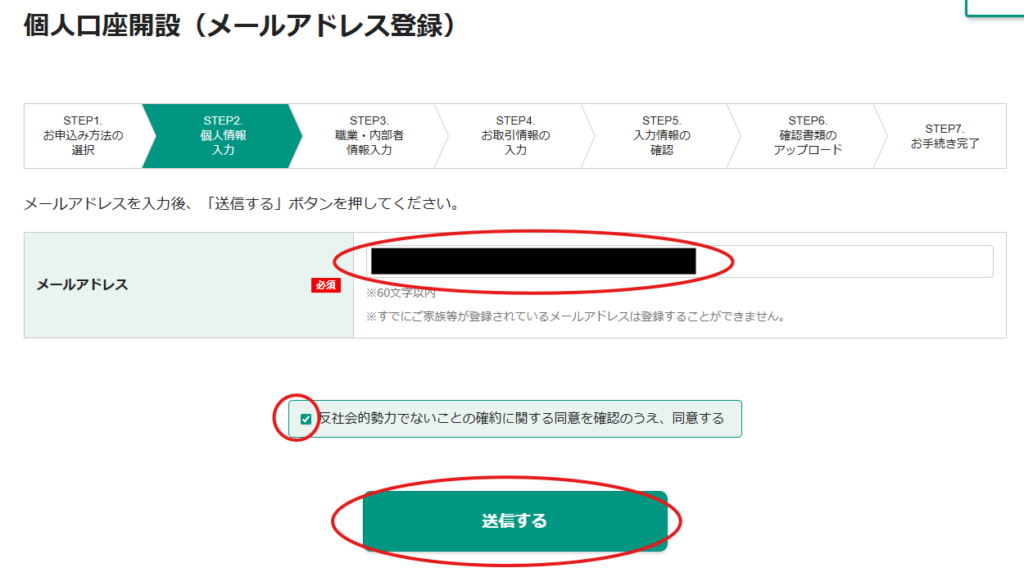 3.「個人口座開設(メールアドレス登録)」画面が開きます。メールアドレスを入力し、確認の上「□反社会的勢力でないことの確約に関する同意を確認のうえ、同意する」にチェックを入れ、「送信する」ボタンをクリックします。