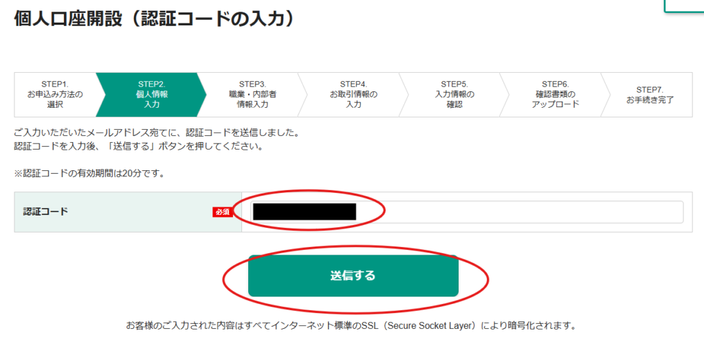 4.メールで送られてきた認証コードを入力の上、「送信する」ボタンをクリックします。
