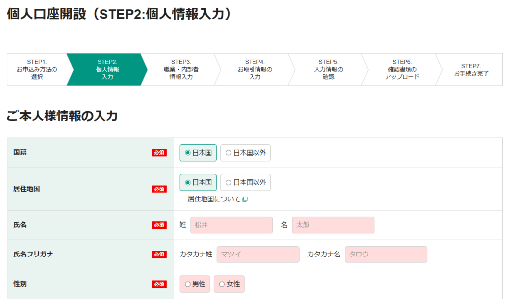 5.「個人口座開設(STEP2:個人情報入力)」画面が開きます。ご本人様情報を入力していきます。すべて入力したら、「次の画面に進む」ボタンをクリックします。