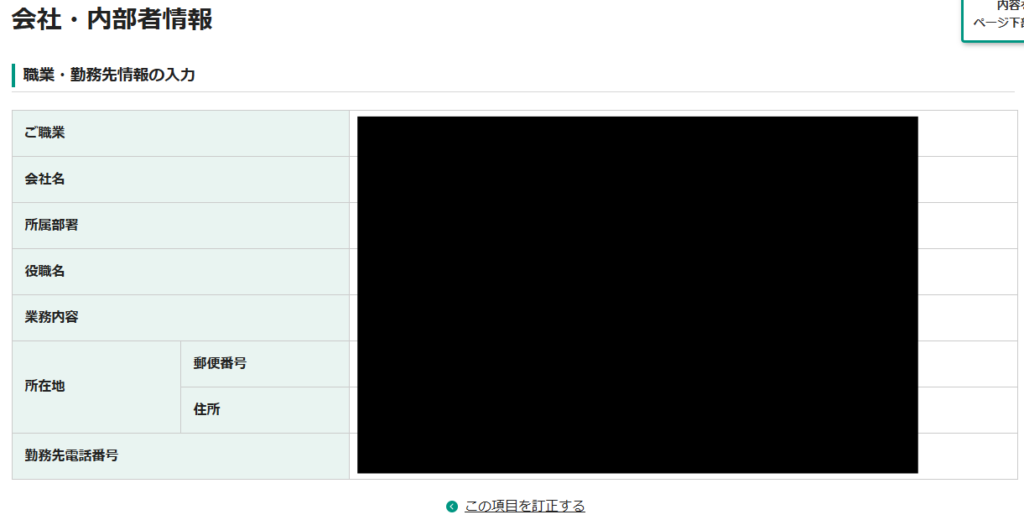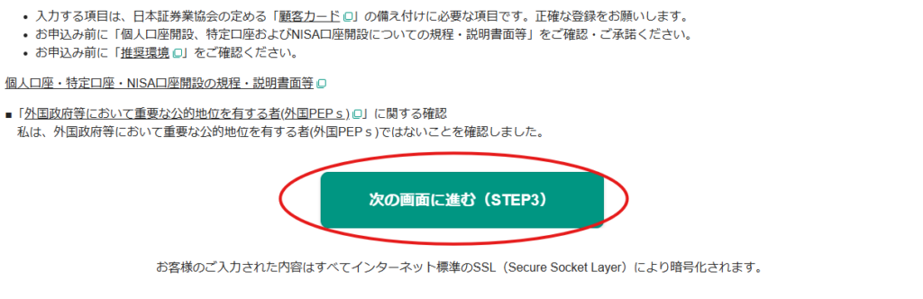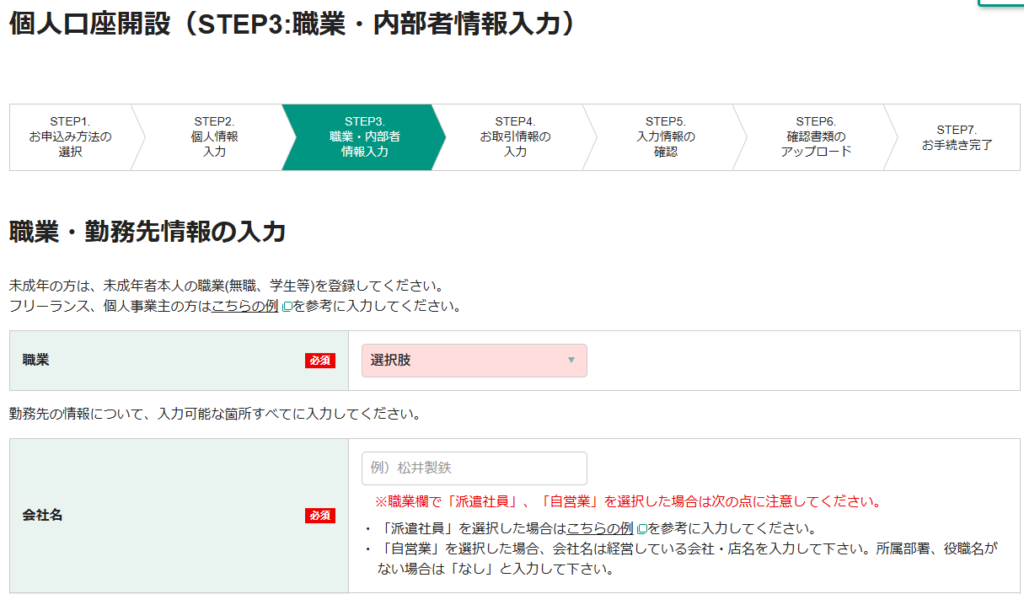 6.「個人口座開設(STEP3:職業・内部者情報入力)」画面が開きます。職業・勤務先情報を入力していきます。すべて入力したら、「次の画面に進む」ボタンをクリックします。