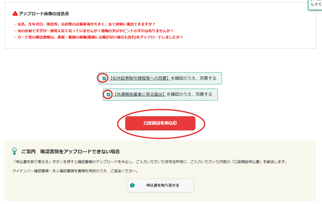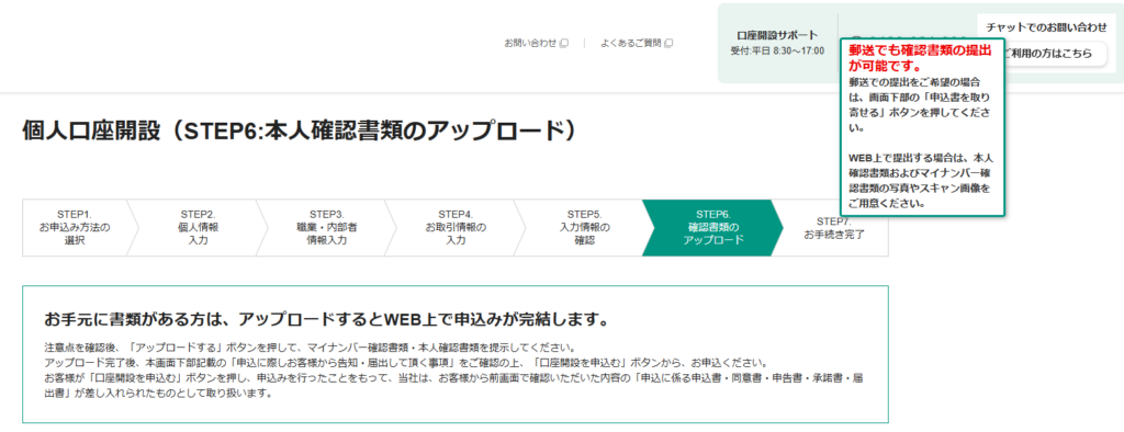 9.「個人口座開設(STEP6:本人確認書類のアップロード)」画面が開きます。筆者は、マイナンバーカードをアプロードしました。アップロードしたら、「○○を確認の上、同意する」を確認の上チェックを入れ、「口座開設を申込む」ボタンをクリックします。