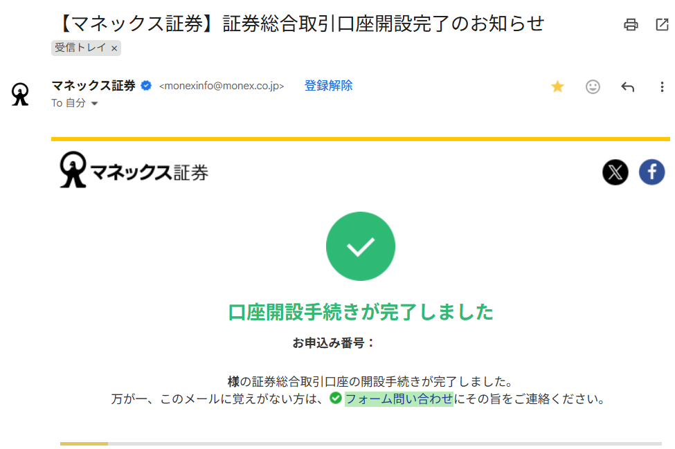 口座開設の申し込みをすると、最短で申込日の翌営業日に「【マネックス証券】証券総合取引口座開設完了のお知らせ」というタイトルのメールが送られてきます。