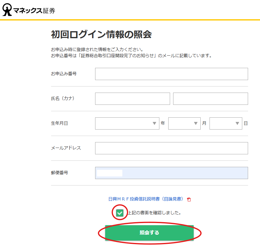 3.「初回ログイン情報の照会」画面が開きます。ここでは、申込時に登録した情報を入力します。入力したら、「日興MRF投資信託説明書(目論見書)」を確認の上、「上記の書面を確認しました。」にチェックを入れ、「照会する」ボタンをクリックします。