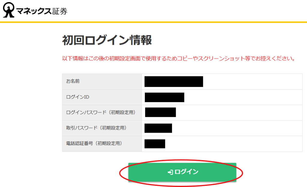 4.「初回ログイン情報」画面が開きます。この情報は後で使用するため、控えておきます。コピーやスクリーンショット等をとったら、「ログイン」ボタンをクリックします。