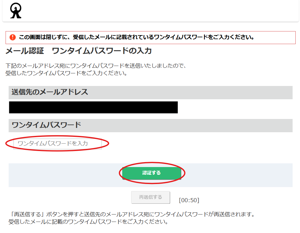 6.メールにワンタイムパスワードが送信されます。ワンタイムパスワードを入力し、「認証する」ボタンをクリックします。