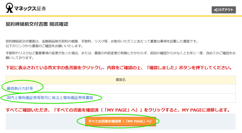7.「契約締結前交付書面 閲読確認」画面が開きます。各書面をクリックし、内容を確認し、「確認しました」ボタンをクリックします。全書類について完了したら、「すべての書面を確認済(「MY PAGE」へ)」ボタンをクリックします。