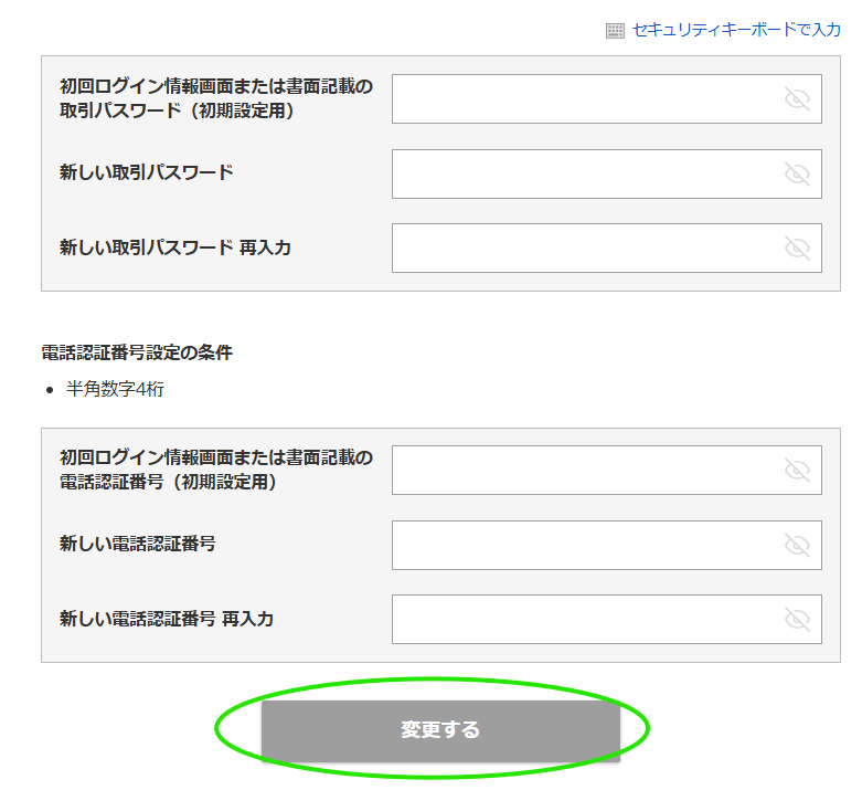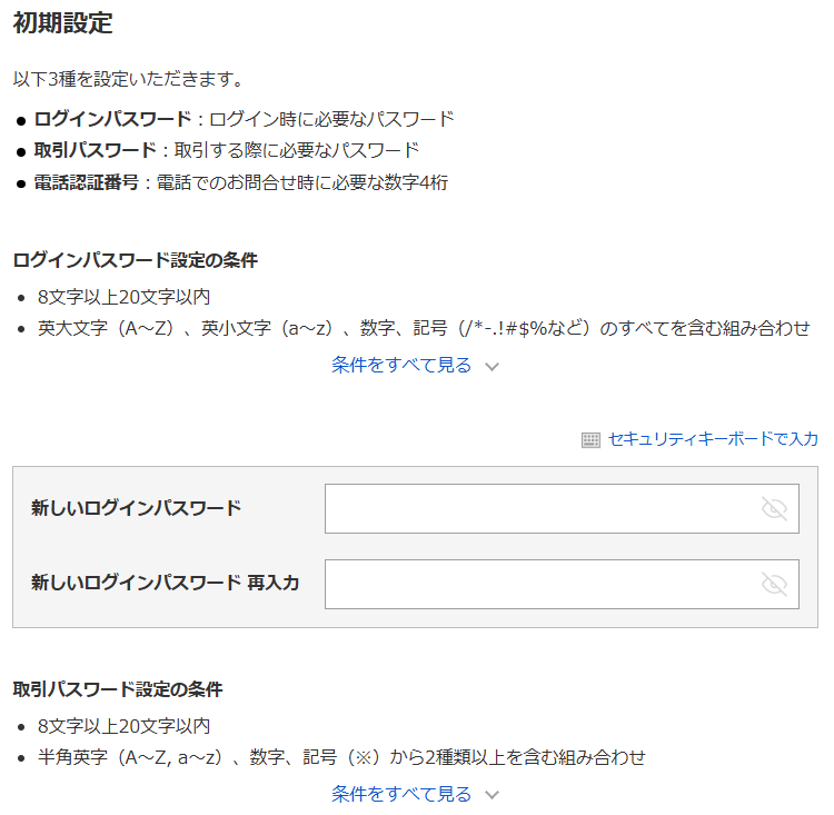 9.「初期設定」画面が開きます。ログインパスワード・取引パスワード・電話認証番号の設定を行います。