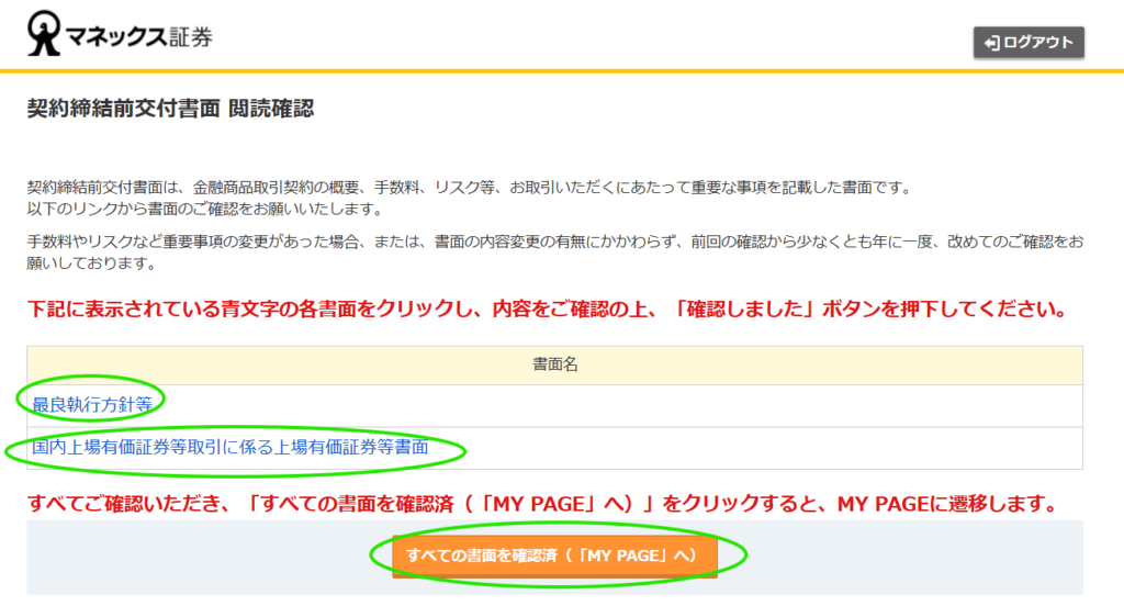 13.「契約締結前交付書面 閲読確認」画面が開きます。各書面をクリックし、内容を確認し、「確認しました」ボタンをクリックします。全書類について完了したら、「すべての書面を確認済(「MY PAGE」へ)」ボタンをクリックします。