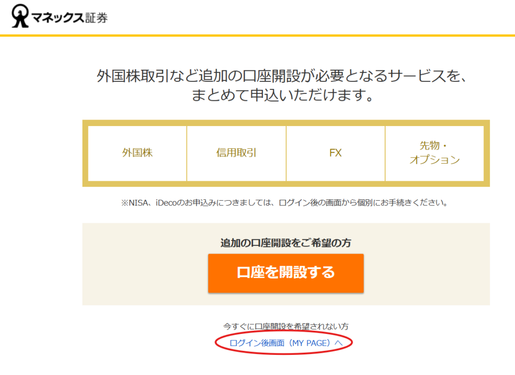 14.追加の口座開設が必要となるサービスの申し込み画面が開きます。このタイミングでお手続きしたい方は「口座を開設する」ボタンをクリックします。筆者は後で設定することにしたので、「ログイン後画面(MY PAGE)へ」をクリックしました。