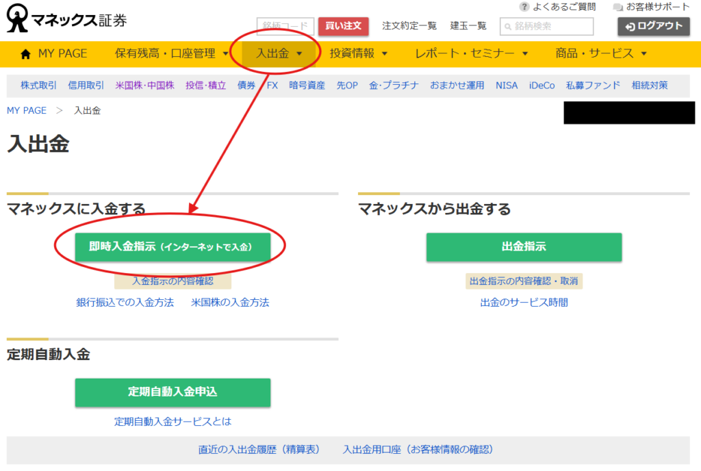1.まず、マネックス証券にログインします。ログインしたら、「入出金」→「即時入金指示(インターネットで入金)」をクリックします。