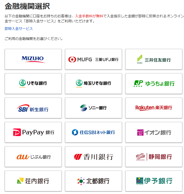 「即時入金サービス」なら手数料無料で、提携銀行から入金をすることができます。利用可能な金融機関は、次の通りです。