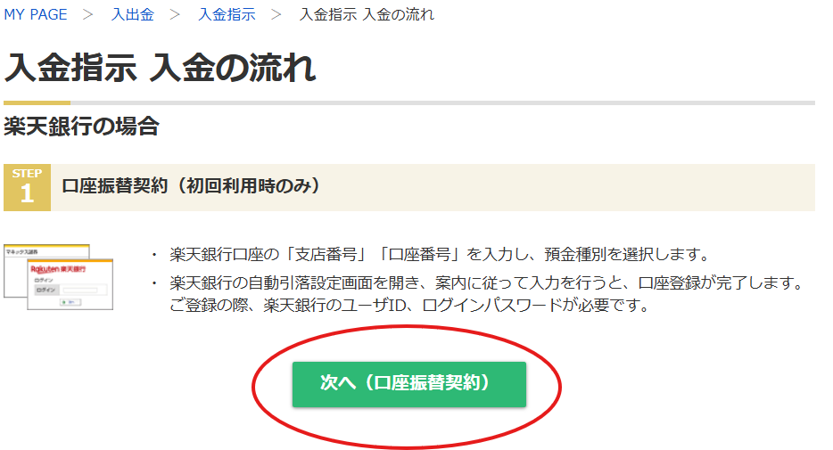 9.次回から「入出金」→「即時入金指示(インターネットで入金)」をクリックすると、「契約済の金融機関」に楽天銀行が表示されるようになりました。こちらをクリックします。
