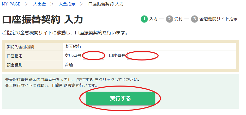 4.「口座振替契約 入力」画面が開きます。「支店番号」「口座番号」を入力の上、「実行する」ボタンをクリックします。