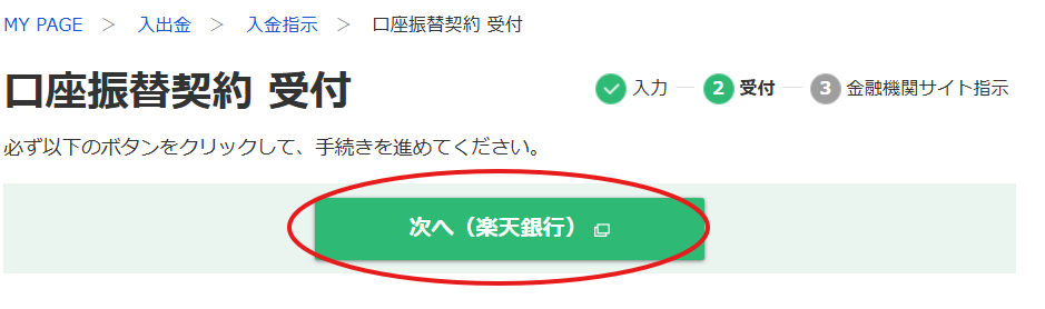 3.「入金指示 入金の流れ」画面が開きます。初回利用時は、口座振替契約が必要です。「次へ(口座振替契約)」ボタンをクリックします。