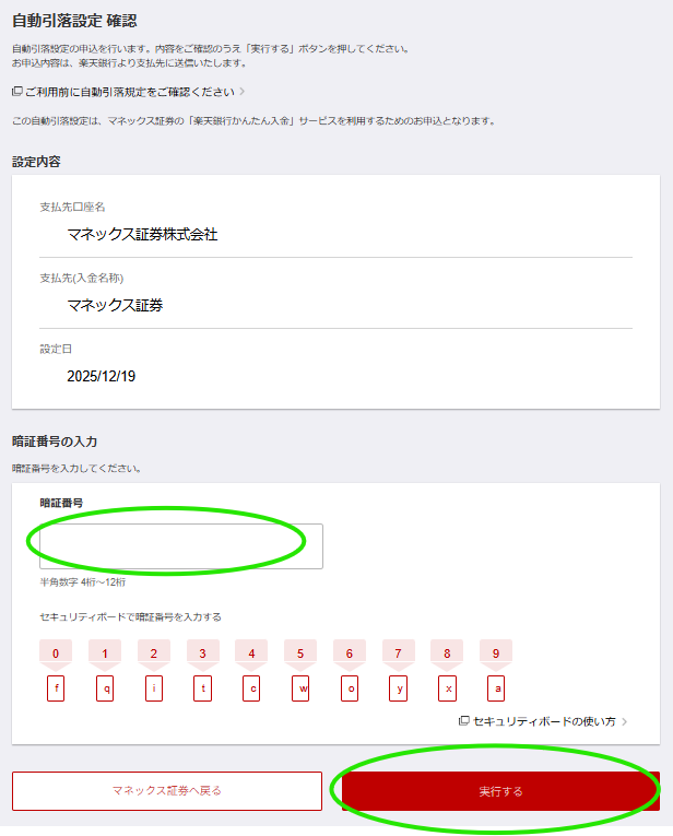 7.暗唱番号を入力し、「実行する」ボタンをクリックします。