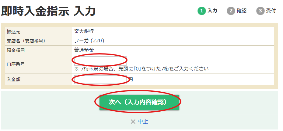 10.「口座番号」と「入金額」を入力し、「次へ(入力内容確認)」ボタンをクリックします。(※楽天銀行での1回の振込入金額は200円から20,000,000円の範囲となります。※2025/12/19時点)