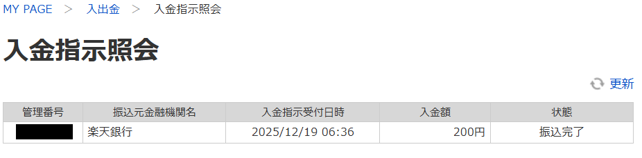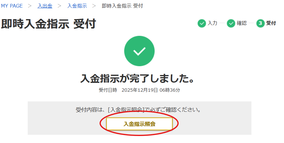 13.「入金指示照会」画面が開きます。自分が指定した入金指示になっていることが確認できました。入金、大変お疲れ様でした。