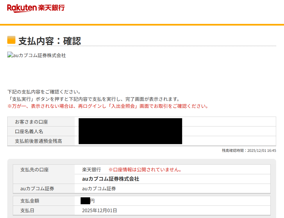 4.金額を確認し、注意事項を確認の上、「楽天銀行へ」ボタンをクリックします。