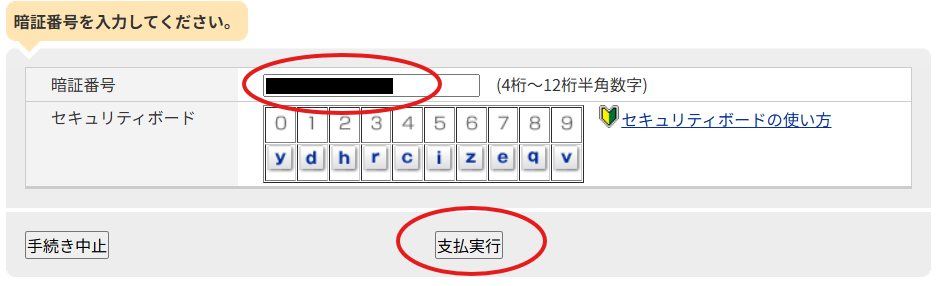 6.ログインしたら、支払い内容を確認の上、暗証番号を入力し、「支払実行」ボタンをクリックします。