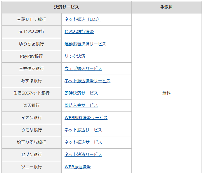 詳しくは、次の表のとおり、さまざまな入金方法があります。