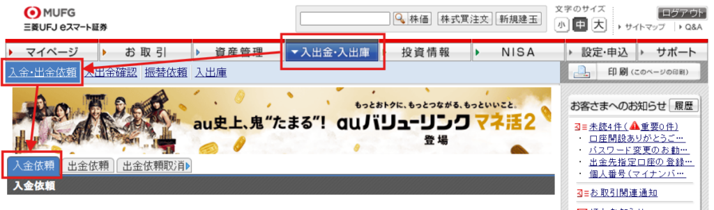 1.まず、三菱UFJ eスマート証券にログインします。ログインしたら、「入出金・入出庫」→「入金・出金依頼」→「入金依頼」に進みます。