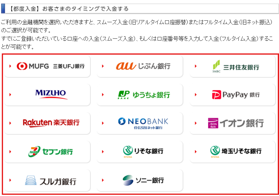 「フルタイム入金」なら事前の登録不要・振込手数料無料で、提携銀行から入金をすることができます(筆者の例※楽天銀行 では100円という少額でも無料で入金できることが確認できております)。利用可能な金融機関は、次の通りです。