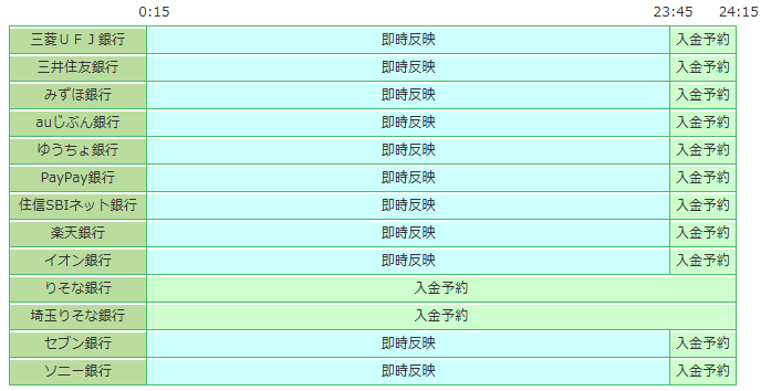 「フルタイム入金」なら事前の登録不要・振込手数料無料で、提携銀行から入金をすることができます(筆者は楽天銀行から100円という少額でも、手数料無料で即時入金できることを確認済みです)。利用可能な金融機関は、次の通りです。