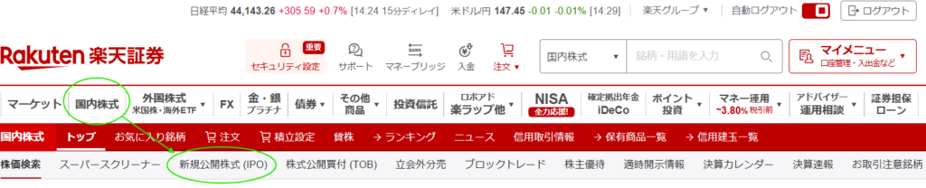 楽天証券にログインし、「国内株式」→「新規公開株式(IPO)」を選択します。