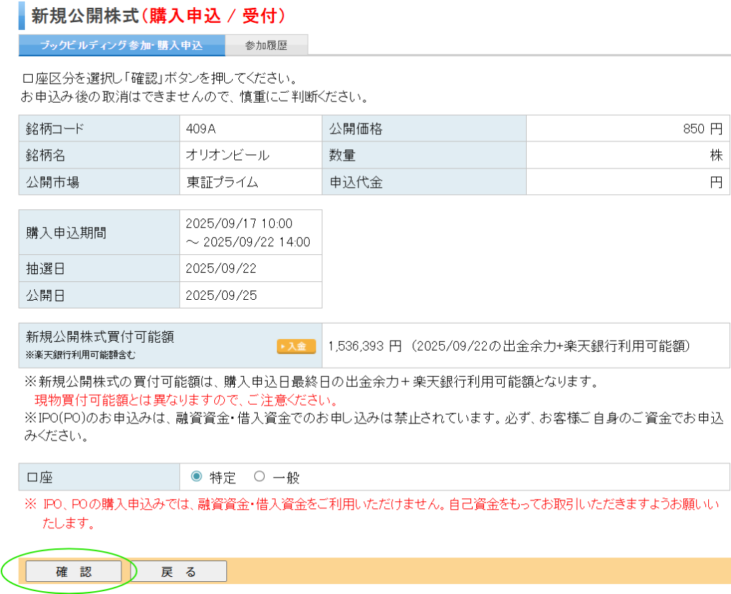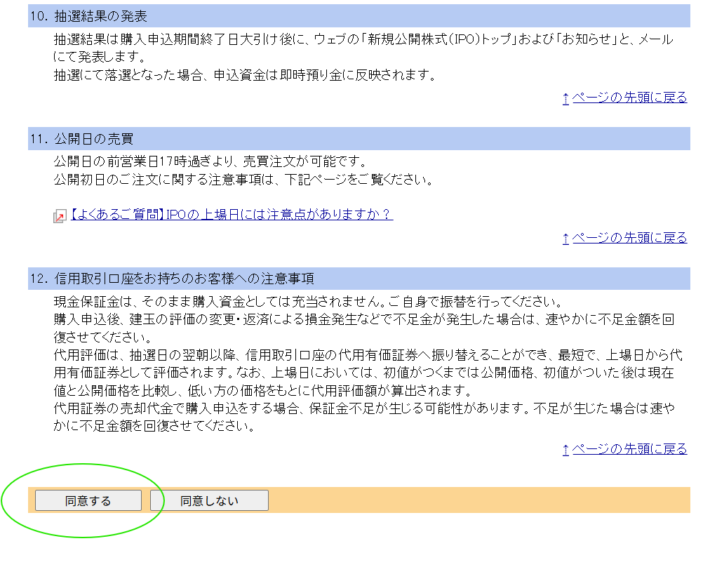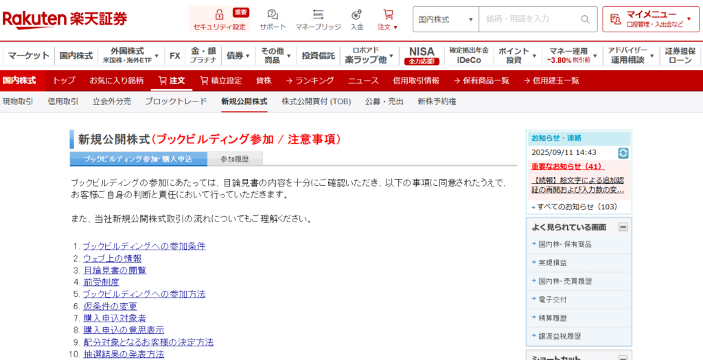 「新規公開株式(ブックビルディング参加 / 注意事項)」画面が開きます。