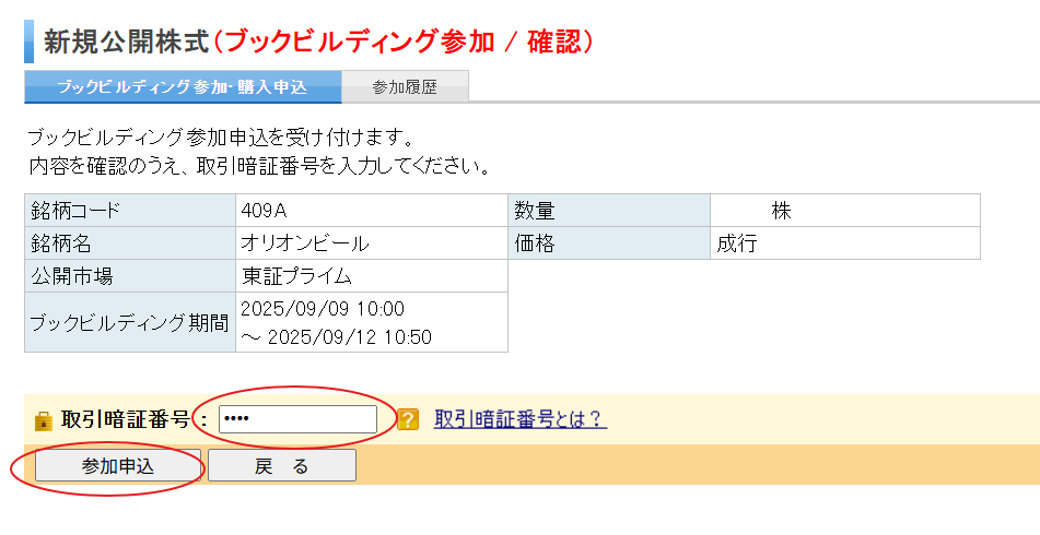 「取引暗証番号」を入力し、「参加申込」ボタンをクリックします。