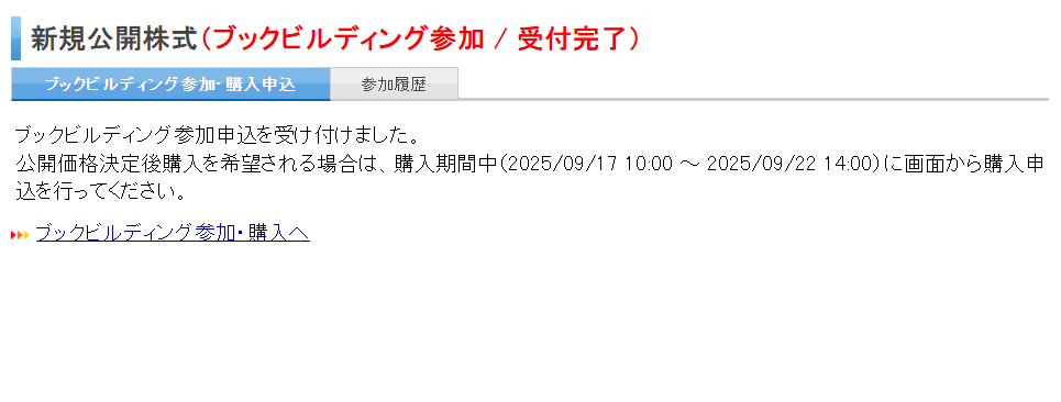 「新規公開株式(ブックビルディング参加 / 受付完了)」画面が開きます。