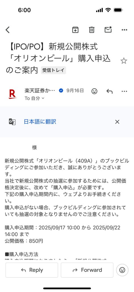 私のケースの場合、購入申込のタイミングで次のお知らせメールが届きました。