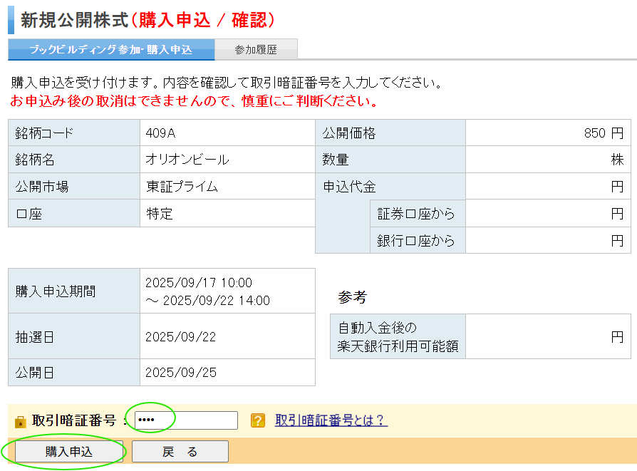 内容を確認し、「取引暗証番号」を入力の上、「購入申込」ボタンを押します。