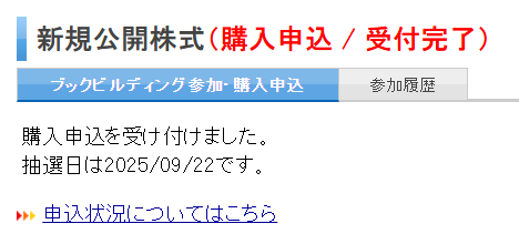 「新規公開株式(購入申込 / 受付完了)」画面が開きます。