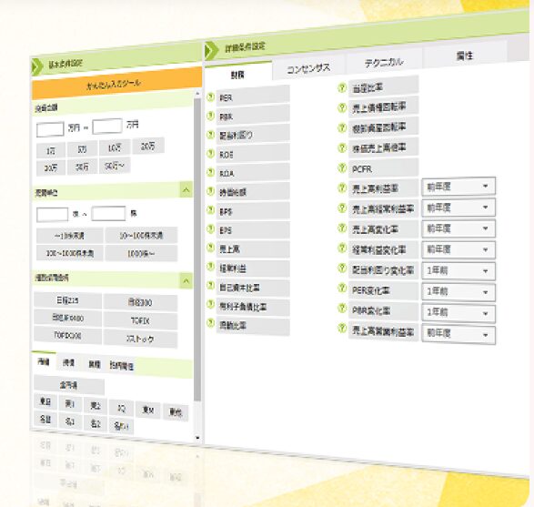 200項目以上の条件で銘柄を検索できる、高機能スクリーニングツールです。