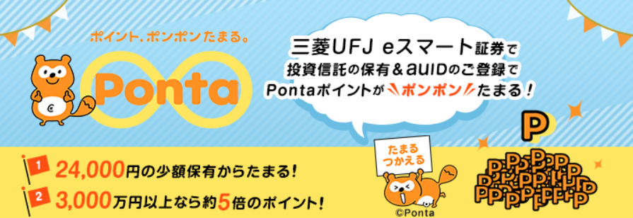 三菱UFJ eスマート証券では、Pontaポイントを投資信託・プチ株(単元未満株)の購入につかえます。※「プレミアム積立(プチ株)」(毎月500円以上1円単位の少額からプチ株を積み立てできるサービス)は対象外です。