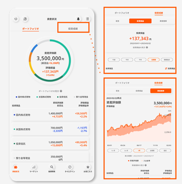 資産状況や運用成績をグラフで確認でき、銘柄検索や注文もスムーズ。
